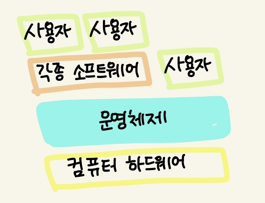 운영체제란 컴퓨터 하드웨어 바로 윗단에 설치되는 소프트웨어이다.
